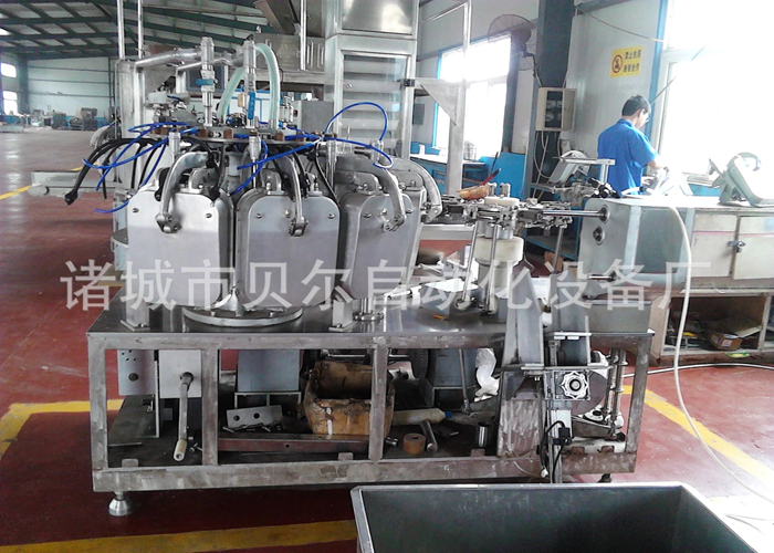 一、產品簡介 給袋式全自動真空包裝機是我廠自主研發的新產品,中國第一臺給袋式全自動真空包裝機于2007年9月誕生于我廠,現在已經申請國家專利,該機能夠使用機械手將真空包裝袋自動取袋,自動撐開,自動打印生產日期及批號,自動上料,自動真空包裝,完全實現無人操作,真正實現自動化包裝。包裝袋范圍長100-260mm,寬60-200mm,包裝效率每小時2000-2600袋。設備通過更換不同的上料系統,可以對液體,膏體,粉末,塊狀等不同的物料進行自動定量真空包裝,配備自動上料機后可以對塊狀物料邊稱量邊真空包裝,該包裝機由日本三菱PLC控制,人機界面使用日本三菱產品,可以對整機進行監控,如果出現空袋及未上袋等異常情況,PLC均能對異常情況進行判斷,然后輸出異常信號,控制包裝機采取相應措施,避免浪費物料及包裝袋。 二、應用范圍 設備主要用于顆粒、粉末、塊狀、液體、軟罐頭、玩具、五金件等產品的全自動包裝,根據不同的物料配套不同的計量裝置,包材損耗低,重量精準,封口品質好,使用預制包裝袋,包裝袋圖案完美,提高產品檔次。給袋式包裝機適用于紙塑復合、塑塑復合、鋁塑復合、PE復合等各類包裝材料。 三、性能特點及原理