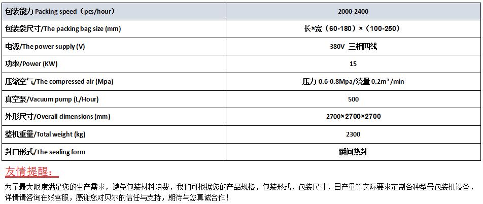 (1)操作方便,采用PLC控制,配觸摸屏人機界面控制系統,操作方便; (2)變頻調速,本機使用變頻調速裝置,在規定范圍內可隨意調節速度; (3)自動檢測功能,如不開袋或開袋不完整時,不加料,不熱封,袋子可再次利用,不浪費物料,為用戶節約生產成本; (4)安全裝置,當工作氣壓不正常或者加熱管故障時,將報警提示; (5)水平送袋方式,儲袋器可以存放更多包裝袋,對成袋質量要求較低,分袋、上袋率高; (6)調整袋寬采用電機控制,按住控制按鈕即可同時調整各組機夾寬度,操作方便,節省時間; (7)采用無油真空泵,避免生產環境的污染; (8)拉鏈開袋機構,專門針對拉鏈袋口特性設計,避免袋口變形或破損; (9)符合食品加工行業的衛生標準,機器上與物料或包裝袋接觸的零部件采用不銹鋼或其他符合食品衛生要求的材料加工,保證食品的衛生和安全。 四、主要技術參數 見附件圖片
